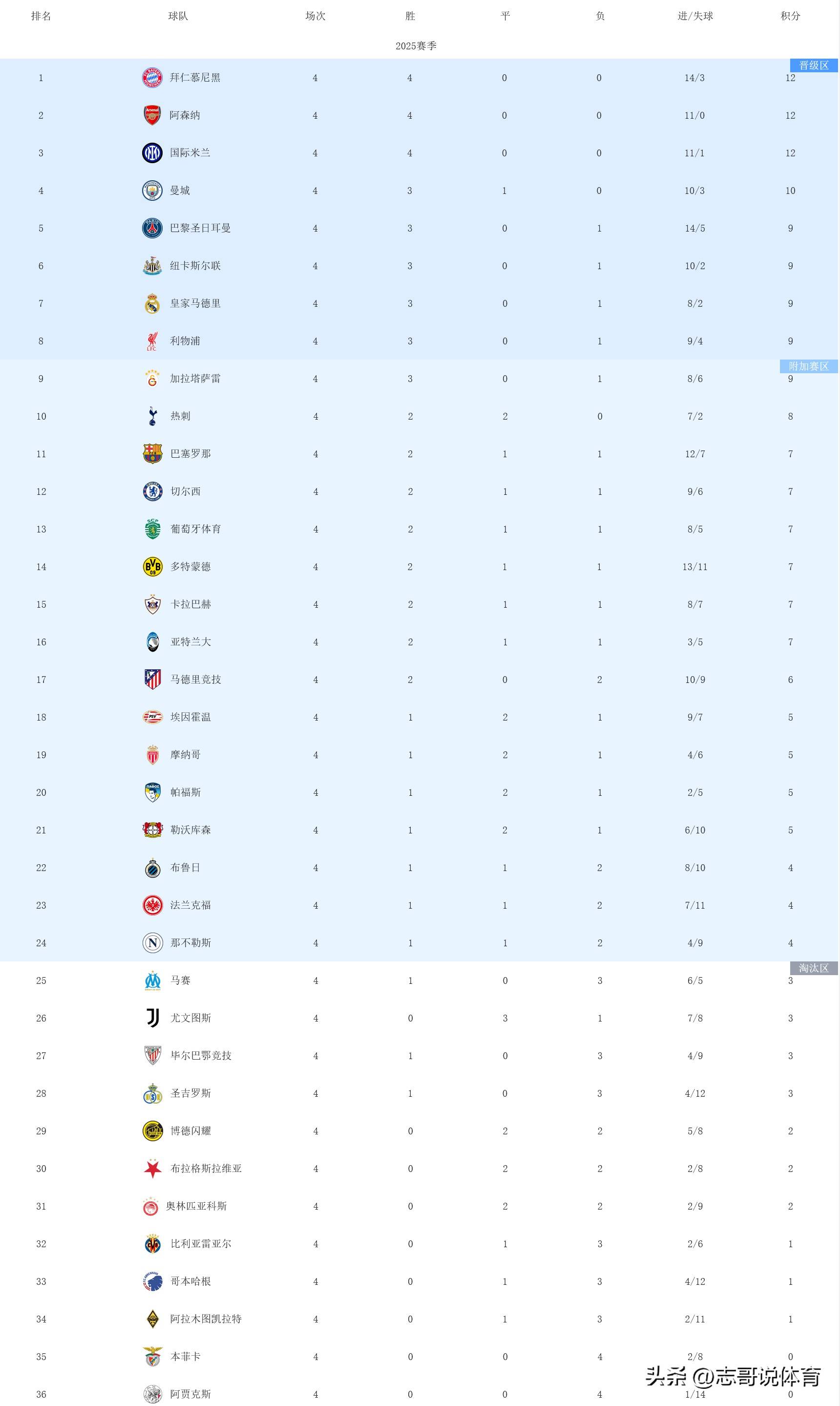 欧冠悲喜夜!4轮后积分榜:3队全胜、拜仁阿森纳国米前三2队4连败